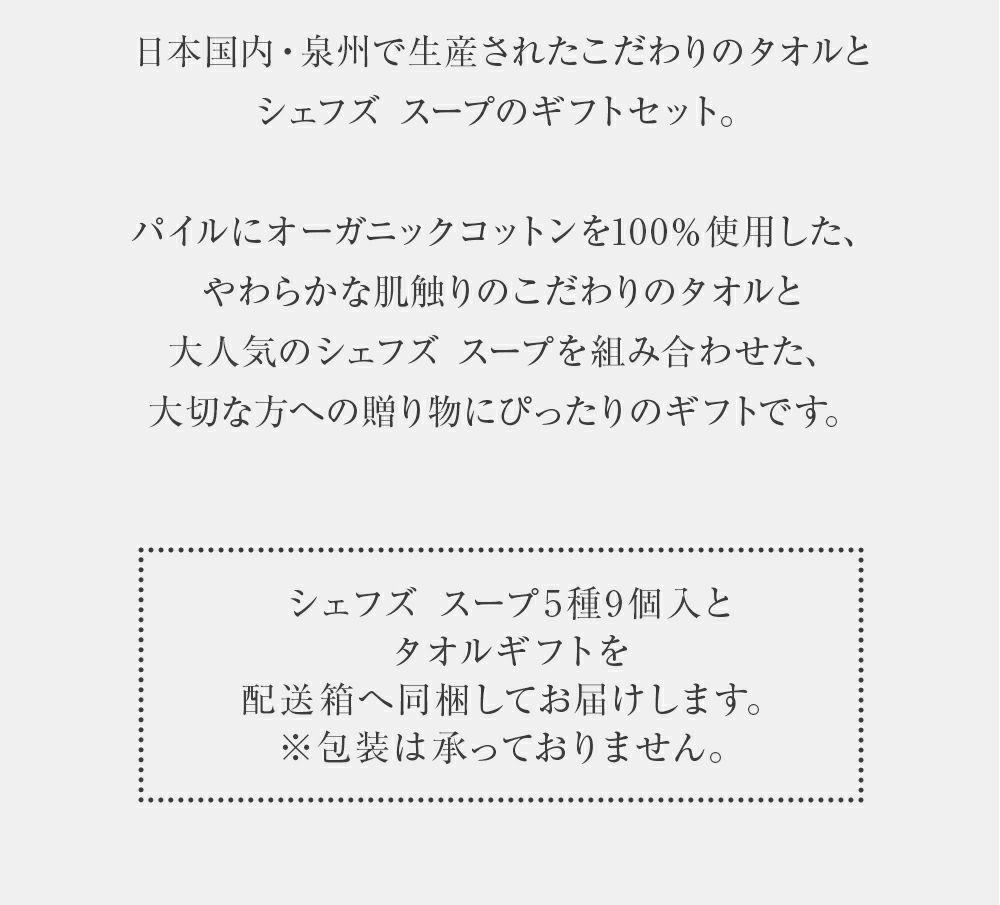 他の画像を見る 日本国内・泉州で生産されたこだわりのタオル シェフズ スープ5種6個入&タオルギフトAセット WH&GY 送料無料 価格 ¥ 6,804 税込 販売期間 2024/08/01 10:00 〜 詳細を見る お気に入りに登録する