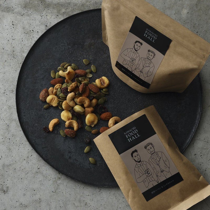 カシューナッツ、アーモンド、ジャイアントコーン(遺伝子組換えでない)、かぼちゃの種、くるみ、マカダミアナッツ、クランベリー、砂糖、卵白(卵を含む)、ベーコン(豚肉を含む)、食塩、オリーブオイル、黒胡椒、にんにく、クミン/調味料(アミノ酸)、酸化防止剤(ビタミンC)、くん液(大豆由来)、発色剤(亜硝酸Na)