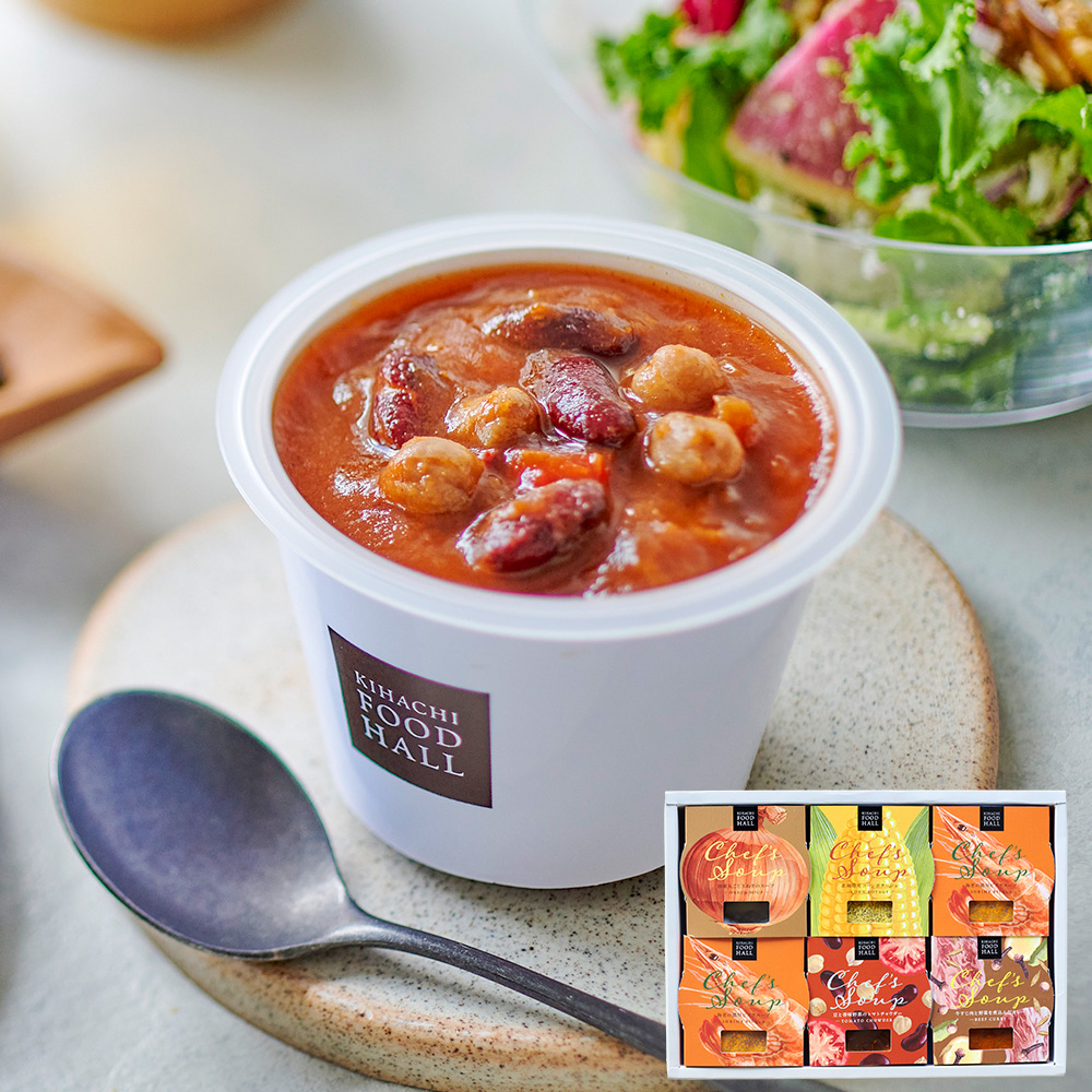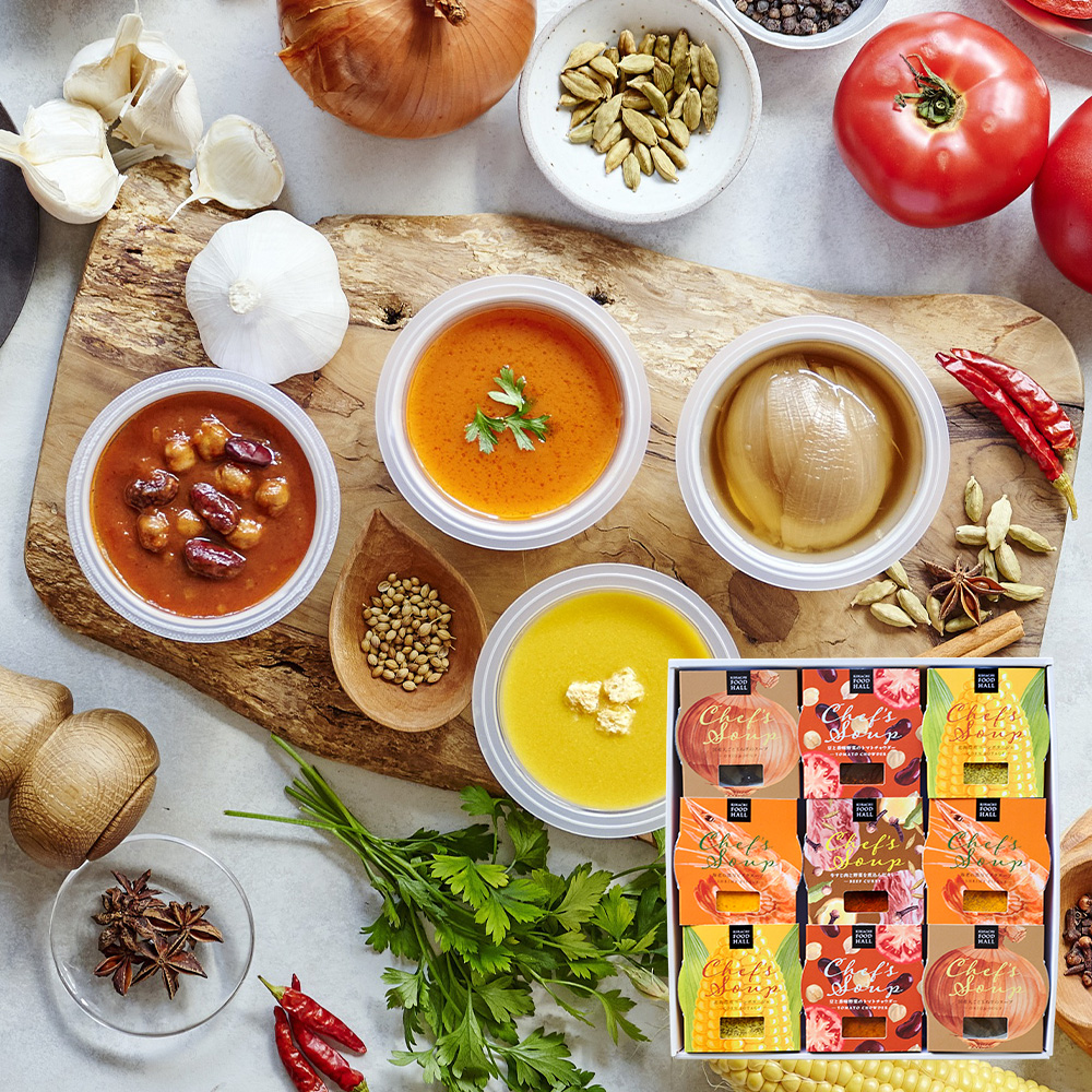 東京青山のレストラン「KIHACHI」のシェフが監修した5種類の美味しいスープとカレーをカップに閉じ込めました。常温で保存でき、食べる時にレンジで1分、温めるだけ。