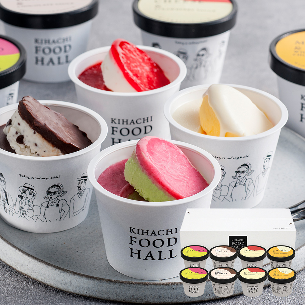 パティスリー キハチで人気のキハチトライフルロール®や、ケーキをイメージしたパフェ仕立てのアイス&シャーベット。5種類の色とりどりのパフェアイスをお楽しみください。